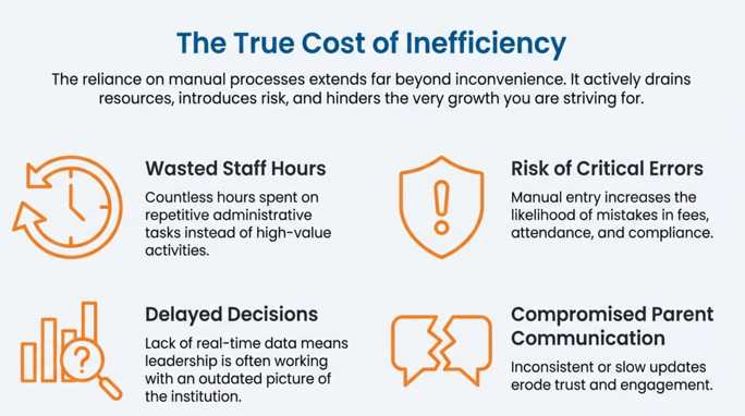 • Higher risk of errors: fees, attendance, compliance, and records become mistake-prone.