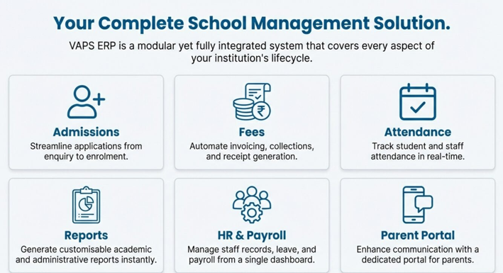 VAPS ERP is modular and fully integrated across the institution lifecycle: